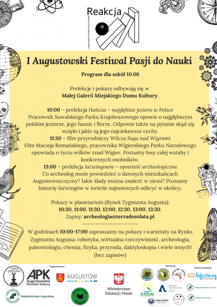 Przedstawiamy Wam program Augustowskiego Festiwalu Pasji do Nauki REAKCJA. Przed nami dwa dni pełne różnorodnych pokazów, warsztatów i prelekcji. Każdy znajdzie coś dla siebie, niezależnie od wieku. 🙂