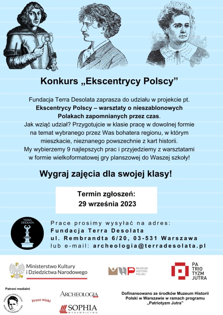 Nasza historia pełna jest niesamowitych postaci, które w swoich czasach można było uznać za ekscentryczne. Szli pod prąd, dokonując nowych odkryć, wynalazków lub wprowadzając przełomowe zmiany w nauce i społeczeństwie. Nie znaleźli się w podręcznikach, lecz warto przypomnieć ich życiorysy. I to chcemy zrobić – odwiedzić szkoły z zajęciami opartymi o wielkoformatową grę planszową „Ekscentrycy Polscy”, w których to uczniowie wcielą się w historycznych bohaterów!