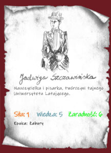 Jadwiga ze Szczawińskich Dawidowa, nauczycielka, publicystka, tłumaczka, a także działaczka oświatowa żyjąca w okresie zaborów… Była gruntownie wykształcona, nauczała w prestiżowej pensji Jadwigi Sikorskiej, ale przez swoje poglądy przeszła do konspiracji i otworzyła tajny Uniwersytet Latający. Działał do 1905 roku, a przez 20 lat działania nie został zdekonspirowany, dzięki niezwykłym umiejętnościom organizatorki! Jadwiga działała też w Kobiecym Kole Oświaty Ludowej oraz zainicjowała powstanie Biblioteki Publicznej w Warszawie. Z mężem psychologiem i pedagogiem Janem Dawidem wydawała kilka czasopism, publikowała w nich teksty m.in. o prawach kobiet i dzieci. Zmarła w 1910 roku śmiercią samobójczą.