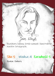 Jan Wnęk to rzeźbiarz, konstruktor, lotnik i prekursor awiacji w Polsce, samouk-wynalazca… Pochodził z chłopskiej rodziny, urodzony w przysiółku Kaczówka (zabór austriacki – Królestwo Galicji i Lodomerii, obecnie Polska). Od małego miał niezwykły talent ciesielski i rzeźbiarski. Znany jest ze swoich figur, które rzeźbił do lokalnych kościołów i kaplic… Jednak szczególnie fascynowały go ptaki i latanie. Skonstruował skrzydła tzw. „loty”, na których w latach 1866-1869 kilkukrotnie z sukcesem poszybował! Pisały o nim gazety np. jedna z krakowskich pisała tak: „w powiecie tarnowskim dziwak chłop lata z dzwonnicy”! 10 czerwca 1869 r. odbył swój ostatni tragiczny lot, zmarł 2 miesiące po wypadku.