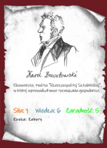 Karol Brzostowski był ekonomistą i twórcą… „Rzeczpospolitej Sztabińskiej”. Hrabia Brzostowski urodził się w Michaliszkach (zabór rosyjski, obecnie Białoruś), gdzie nadal stoi jego rodzinny dwór. Osiadł w Cisowie niedaleko Sztabina, gdzie wprowadzał w swoim majątku przełomowe formy zarządzania, spółdzielczości i nowych technologii rolniczych… Rzeczpospolita Sztabińska była wieloletnim planem reformy majątku rodzinnego w nowoczesny przemysłowo-rolniczy folwark z hutami szkła, żelaza i fabryką maszyn rolniczych… Brzostowski jako pierwszy w kraju wprowadził tzw. buchalterię włoską oraz łączność telegraficzną (od biura do Cisowa). W browarze produkował spirytus i wódkę z buraków cukrowych, ale zwalczał równocześnie alkoholizm wśród chłopów. Zniósł pańszczyznę, wyprzedzał epokę dbając o pracowników folwarku, czy mechanizując uprawę i hodowlę… A wszystko działo się w dobie zaborów!