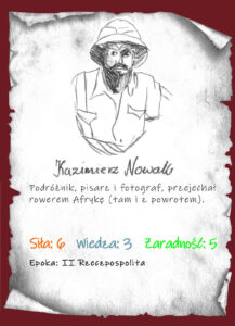Kazimierz Nowak to podróżnik, rowerzysta, fotograf i…pionier reportażu podróżniczego! Pochodził ze Stryja (zabór austriacki – Królestwo Galicji i Lodomerii, dziś Ukraina), mieszkał w Poznaniu. Po utracie pracy urzędnika postanowił połączyć pożyteczne z przyjemnym i został korespondentem prasowym i fotografem. Podróżował po Europie, ale marzył o Afryce. Udało mu się spełnić marzenie i w listopadzie 1931 roku rozpoczął samotną podróż na rowerze! Przemierzył tak Afrykę dwukrotnie: z północy na południe i z południa na północ. Pisał notatki do poznańskich gazet. Powstało ich ponad 100, żona Maria dzielnie nosiła je do redakcji. Wydane zostały dopiero w 2000 roku przez Łukasza Wierzbickiego pt. „Rowerem i pieszo przez Czarny Ląd”. W grudniu 1936 roku Nowak wrócił do Polski, wygłosił kilka wykładów, planował wydanie książki z podróży oraz trzecią wyprawę, tym razem do Indii i Azji Południowo-Wschodniej, niestety zmarł w październiku 1937 roku.
