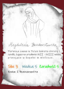 Magdalena Bendzisławska to pierwsza znana w Polsce kobieta chirurg (cyrulik). Była żoną Walerego Bendzisławskiego cyrulika z kopalni soli w Wieliczce. Pomagała mu i tym samym uczyła fachu. Po śmierci męża odziedziczyła posadę i samodzielnie zaczęła leczyć górników (zamiast tradycyjnie zatrudnić czeladnika). By móc legalnie praktykować potrzebowała zgody króla, którą to otrzymała 6 października 1697 roku, czyli tzw. przywilej królewski od Augusta II Mocnego. Jej codzienna praca polegała na opatrywaniu złamań, częstych ówcześnie w kopalniach, nacinaniu ropni oraz… usuwaniu zębów, a to wszystko bez znieczulenia. W Krakowie na Uniwersytecie Jagiellońskim – Collegium Medicum od kilku lat przyznawany jest Medal im. Magdaleny Bendzisławskiej wybitnym Polkom specjalizującym się w chirurgii…