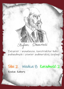 Stefan Drzewiecki to wynalazca i prekursor prac nad przemieszczaniem się pod wodą… Urodził się w rodzinnym majątku Kunka na Podolu (zabór rosyjski, obecnie Ukraina). Jako 15-latek trafił aż do Paryża, gdzie w otoczeniu skandalu nie ukończył liceum (choć maturę zdał świetnie). Nie ma tego złego, bo trafił potem do przemysłowej wyższej szkoły. Po powstaniu styczniowym wrócił na uczelnię i… opracował swój pierwszy wynalazek – drogomierz dla dorożek. Trafił potem do Wiednia, gdzie wynalazł dromograf do statków, który tak spodobał się carskiemu bratu, że Drzewiecki dostał pracę doradcy Komitetu Technicznego Marynarki Rosyjskiej. Od tego czasu jego kariera nabrał rozpędu. Skupił się na podwodnych machinach – wymyślił jednoosobową łódź podwodną z napędem nożnym, „podwodny aparat minowy” (była to pierwsza łódź podwodna z peryskopem!). Kolejne wynalazki powstały już w Paryżu np. okręt podwodny z wyrzutniami torped czy maszyny latające jak samolot samostateczny. Jego publikacje wsparły wielu ówczesnych naukowców i wynalazców… Drzewiecki nigdy nie wrócił do Polski, ale wspierał różnymi sposobami rodzimych naukowców.