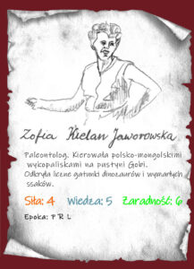Zofia Kielan-Jaworowska to polska paleontolożka, paleobiolożka i popularyzatorka nauki. Uczestniczyła, a potem kierowała polsko-mongolskimi misjami na pustyni Gobi. Dokonano wtedy przełomowych odkryć w zakresie wymarłych gatunków ssaków i dinozaurów. Była autorką lub współautorem ponad 230 książek i artykułów naukowych! Od jej imienia nazwano też wiele gatunków zwierząt np. Indobaatar zofiae, Kielanodon, Kielantherium, Zofiabaatar… Podczas II WŚ należała do Szarych Szeregów, brała udział w PW jako sanitariuszka, odznaczono ją wraz z rodzicami i siostrą tytułem „Sprawiedliwy wśród Narodów Świata”.
