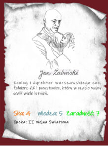 Kolejny bohater gry to Jan Żabiński – zoolog, popularyzator nauki, organizator i wieloletni dyrektor Ogrodu Zoologicznego w Warszawie. Od zawsze kochał zwierzęta (dzięki matce). Chciał studiować biologię, ale I WŚ popsuła mu plany i wylądował na kierunku rolniczym, co potem chwalił, jako pomocne w zoo… Popularyzował też zoologię na antenie Polskiego Radia przez około 40 lat! W 1929 roku został dyrektorem warszawskiego zoo, gdzie spełniał się i odnosił sukcesy. Podczas II WŚ ogród był azylem dla ludzi i zwierząt. Jan brawurowo szmuglował ludzi z getta wywożąc odpadki do karmienia zwierząt, a jego żona pisarka Antonina zajmowała się nimi do czasu wyrobienia aryjskich dokumentów… Po wojnie oboje skupili się na odbudowie ogrodu i ratowaniu polskich żubrów. Jednak Jan został w 1951 roku odwołany z posady dyrektora zoo i poświęcił się popularyzacji nauki, a Antonina wydała kilka kolejnych książek… Po latach Jan i Antonina Żabińscy zostali odznaczeni tytułem „Sprawiedliwy wśród Narodów Świata”.