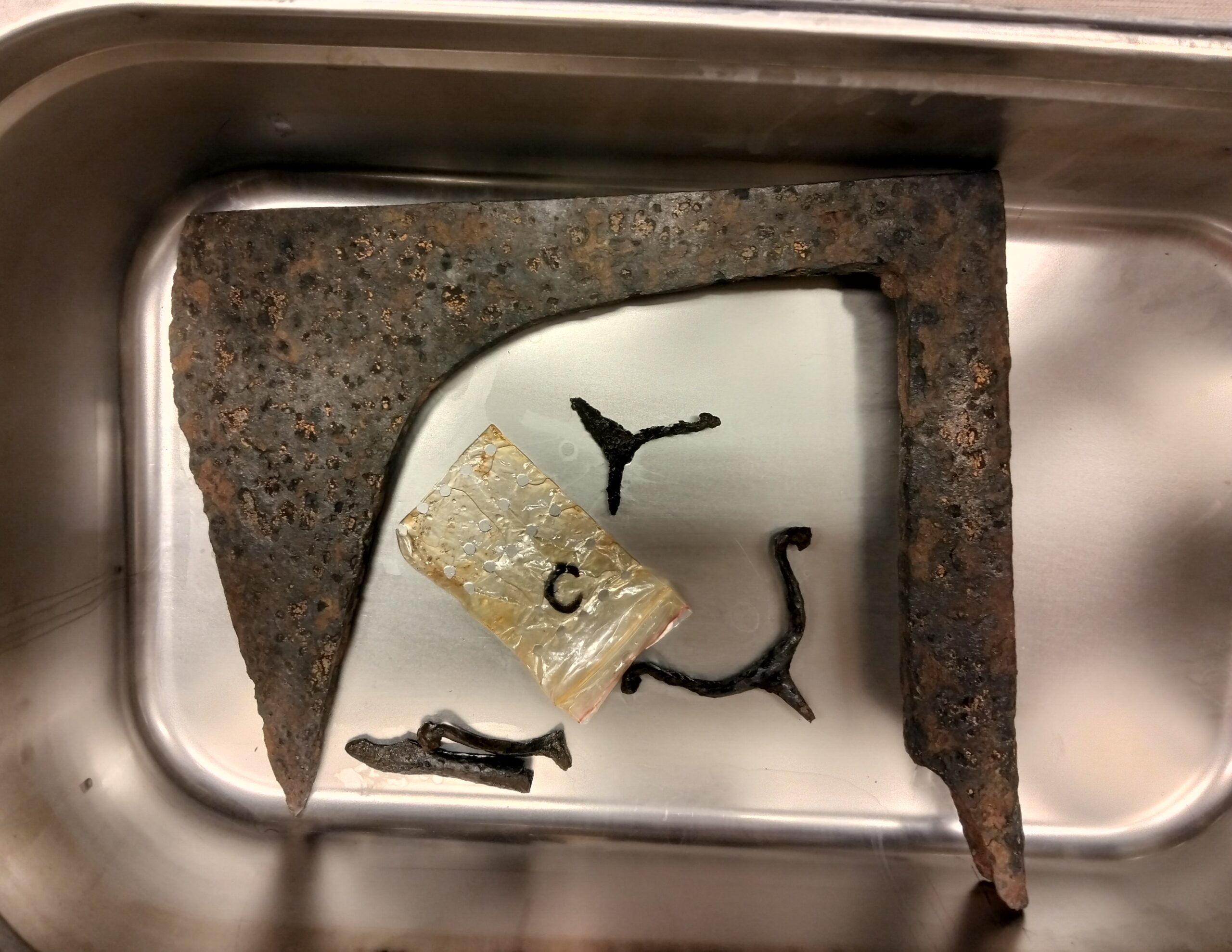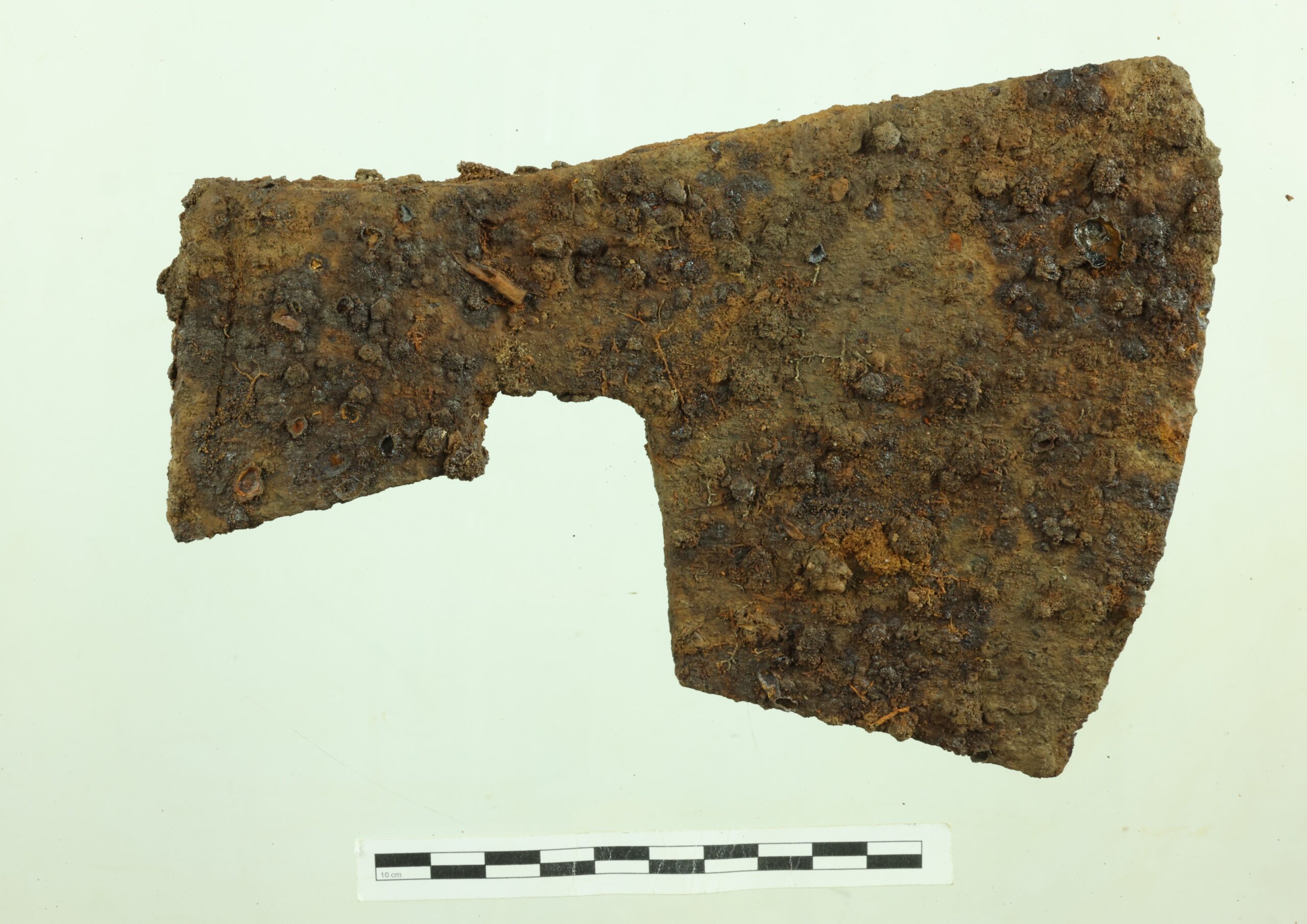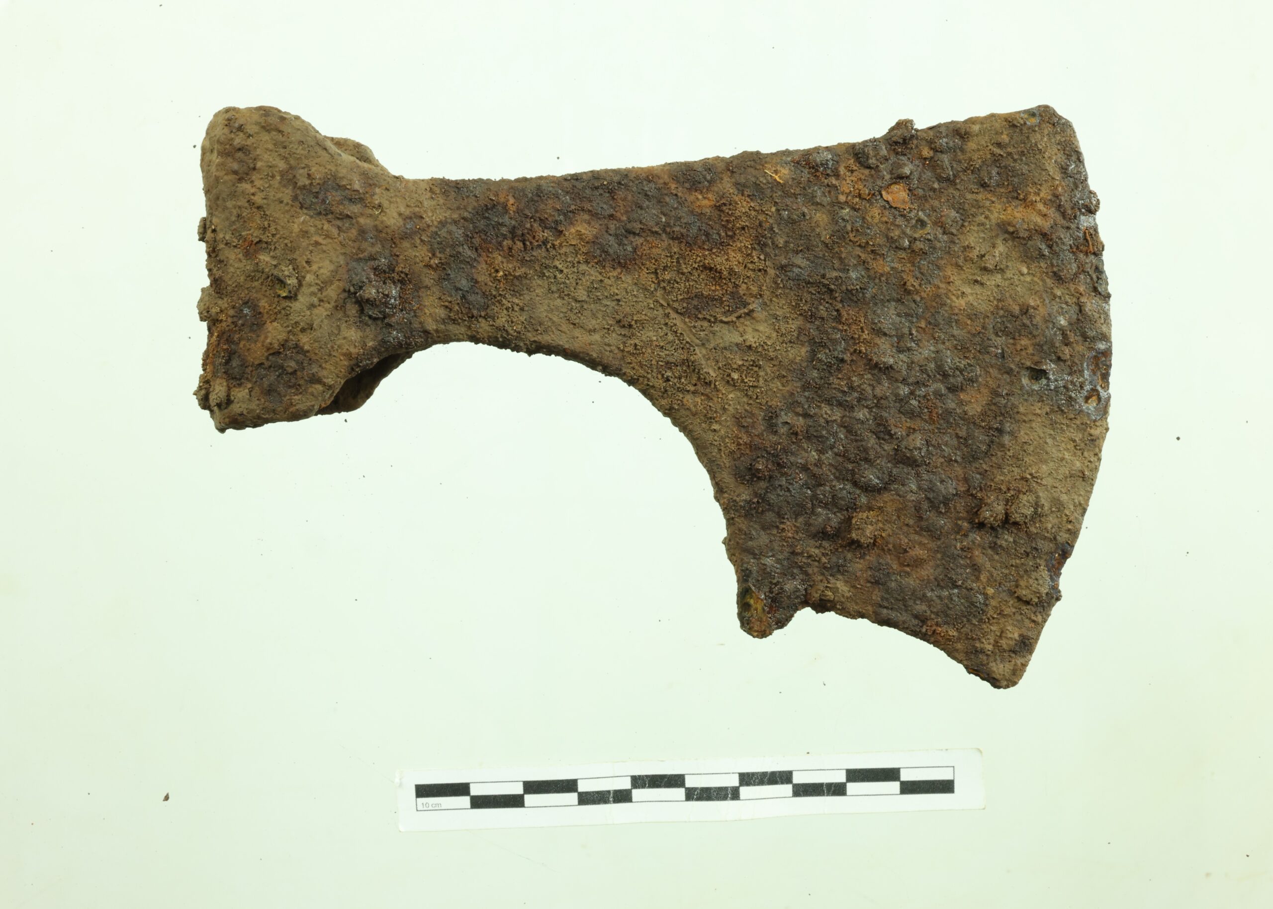 Teren odkrycia stanowi jeziorny półwysep. Wszystkie topory zalegały wzdłuż jednego z jego brzegów. Ich rozrzut względem siebie, tworzy półtora kilometrową i w miarę prostą linię, zgodną zresztą z przebiegiem lokalnego duktu, który jak sądzimy, mógł istnieć współcześnie do naszego znaleziska. Pierwszy z toporów znajdował się u nasady półwyspu, drugi w jego głębi, a trzeci i czwarty leżały blisko siebie, już na samym końcu półwyspu. Topory datujemy na późne średniowiecze (II poł. XIV-XV wiek), choć jeden z nich może być też nieco wcześniejszy, a jeden nieco późniejszy. Na co najmniej dwóch, w trakcie konserwacji ujawniły się stemple kowalskie.