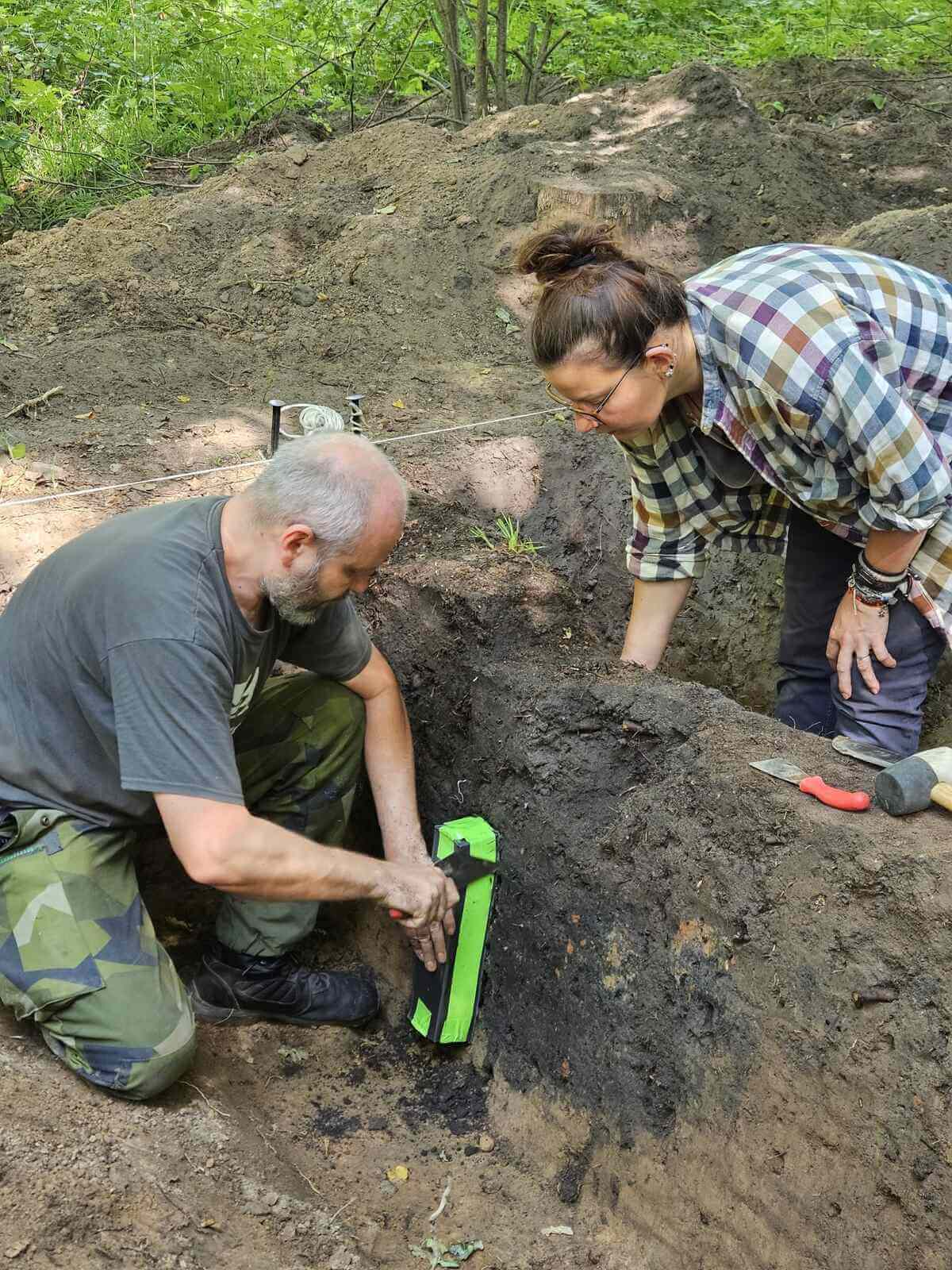 Innym rodzajem próbek są tzw. monolity pobierane pod kątem badań palinologicznych z obiektów archeologicznych np. jam, czy palenisk. Ich przygotowanie wymaga działania na wykopie z użyciem np. metalowych rynienek, które wbija się w profil obiektu. Podczas lipcowych wykopalisk pobieraliśmy takowe monolity – po raz pierwszy w naszej fundacyjnej historii – rękami nieocenionego Michała Duchlińskiego. Ostreczowane, by nie zaburzyć i nie zabrudzić pobranego materiału i opisane także trafiają do laboratorium, gdzie określa się zachowane pyłki roślin nasiennych, zarodniki mszaków, paprotników i grzybów… Dzięki pomysłowości Przemka Malickiego mamy do procesu flotowania porządny sprzęt, a dzięki wsparciu dr hab. Aldony Mueller-Bieniek, dr Katarzyny Cywy i dr Artura Teodorskiego ciągle doskonalimy techniki przygotowywania próbek.