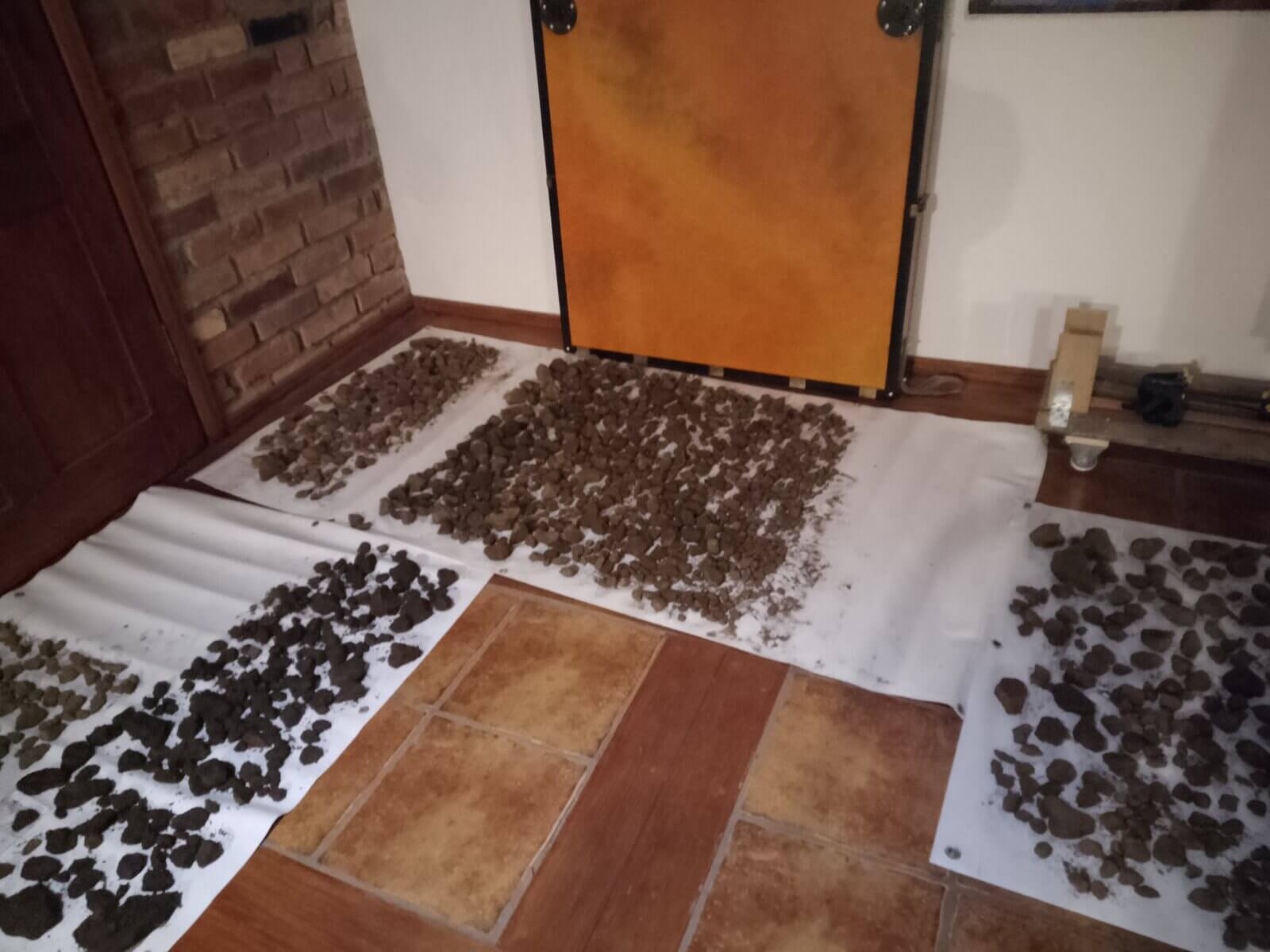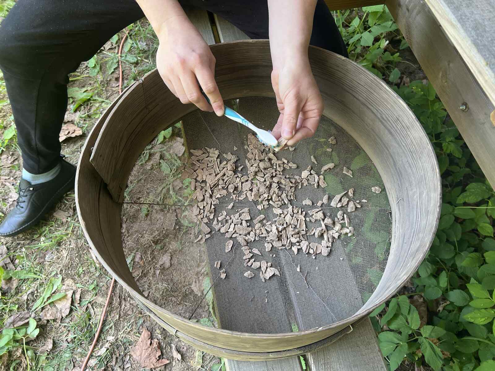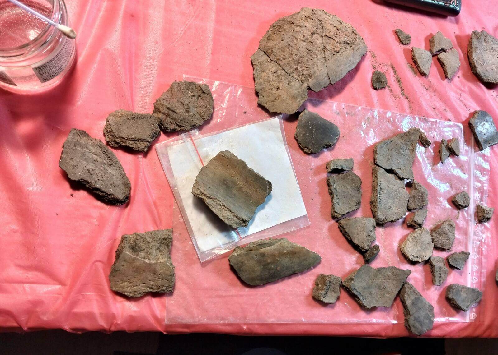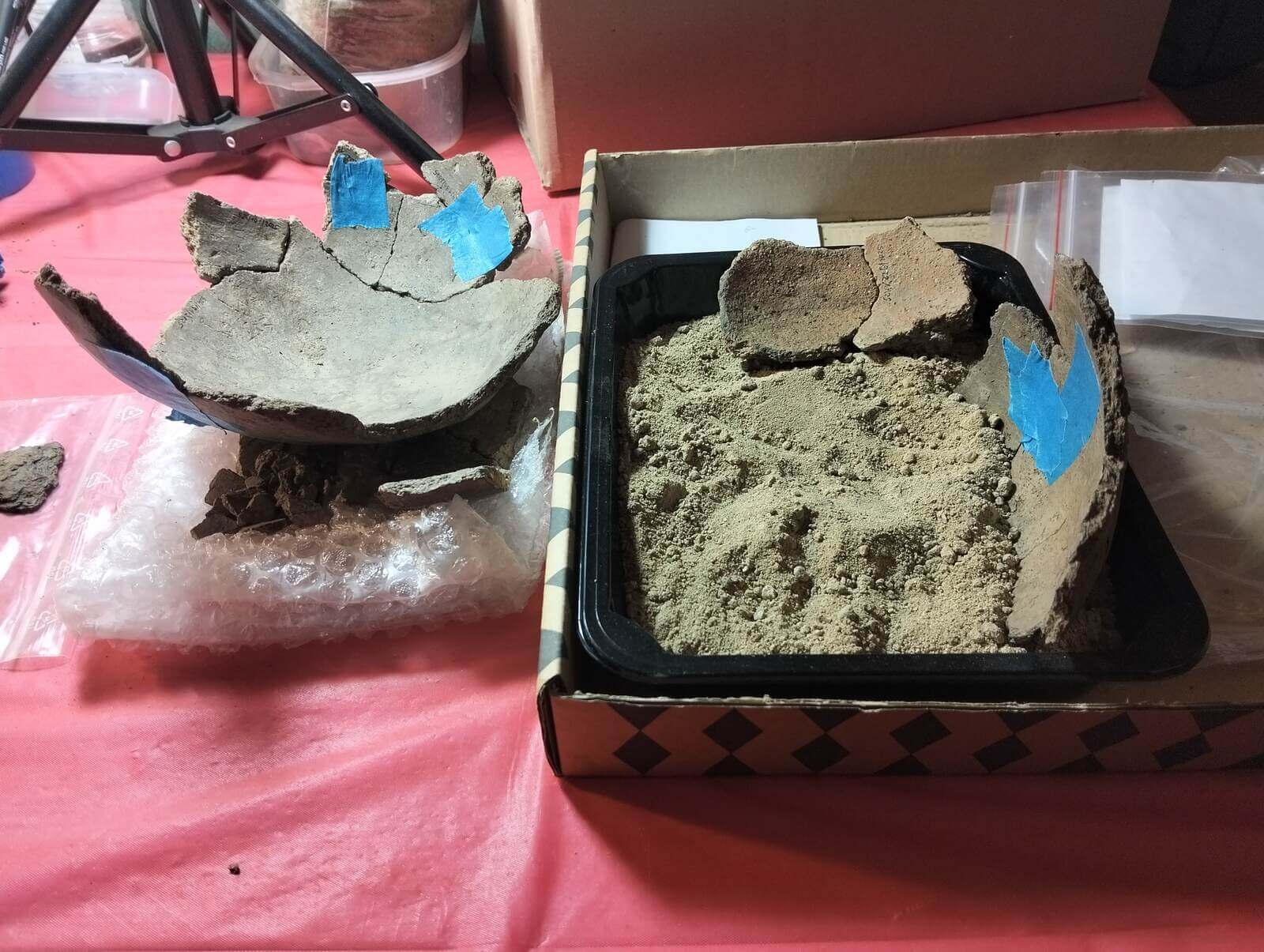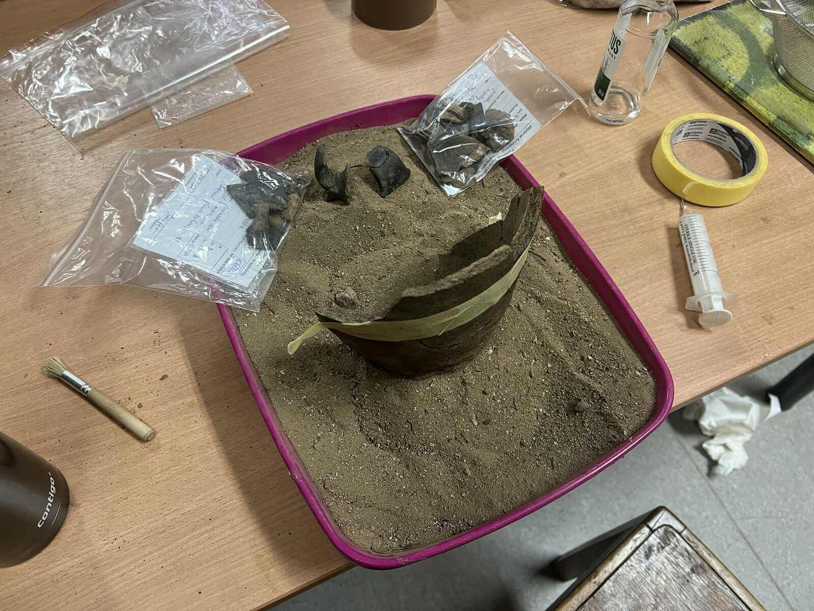 Ceramika i inne gliniane przedmioty wymagają rozłożenia do przeschnięcia. Jest to zabieg wskazany przed umyciem ich z piasku, by się nie rozpadały. Tak samo kości ludzkie i zwierzęce muszą przeschnąć przed oczyszczeniem z piasku – tu pozdrawiamy producentów szczoteczek do zębów ;), a oczyszczone i zinwentaryzowane trafiają do antropologa, bądź archeozoologa. Wykopowa ekipa wymiennie dzielnie wykonuje tę niezbędną pracę, bo te działania dzieją się jako „druga zmiana” w trakcie badań wykopaliskowych. Umyta ceramika musi porządnie wyschnąć, a potem czekają ją kolejne etapy już nie „na wykopie”, a w zaciszu pracowni… Podpisywanie – papierologia musi się zgadzać! – oraz wyklejanie naczyń. Tą żmudną, ale niezbędną pracą zajmują się w naszym projekcie dr hab. Paweł Szymański i jeden z naszych fundacyjnych fachowców od ceramiki Paweł Drzazga, wsparcia przy podpisywaniu ogromu fragmentów ceramiki dzielnie udzielają szefowa projektu Iwona Lewoc, Monika Radzikowska, Natalia Bawolak, Przemysław Malicki i Agata Knobloch.