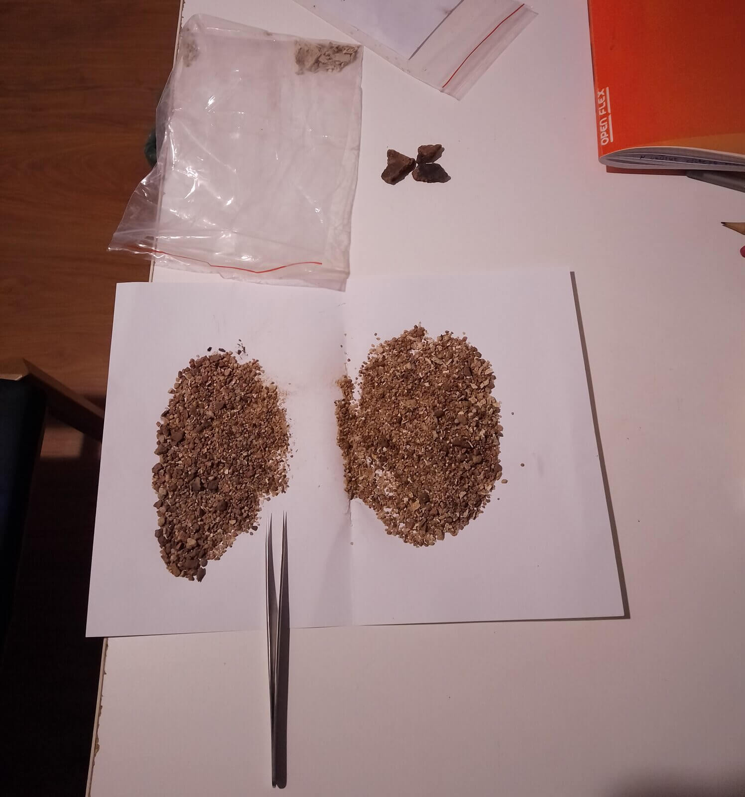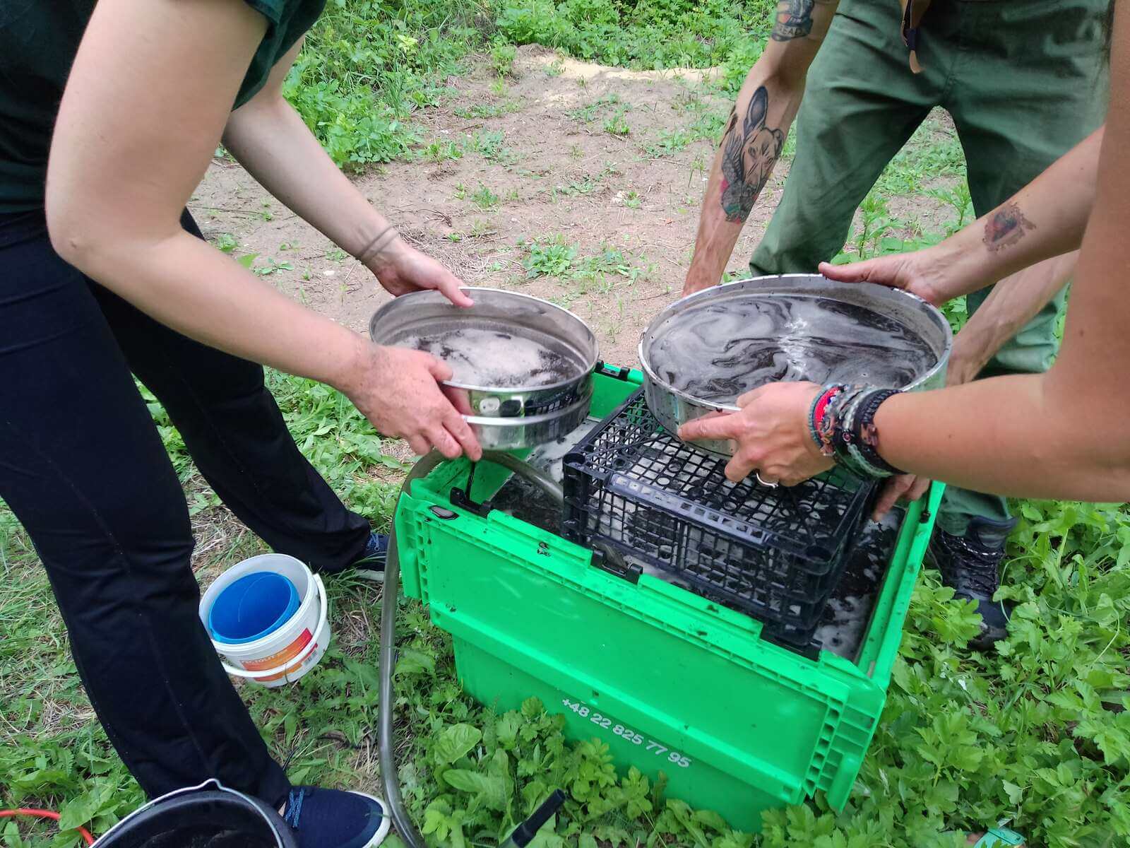 Ponadto, jak już wiecie 😉 pobieramy różne próbki do badań interdyscyplinarnych. Część z nich musi przejść powykopową procedurę, aby mogły trafić do specjalistów. Próbki do analiz archeobotanicznych pobierane zazwyczaj o objętości 6 litrów muszą zostać przeflotowane wodą przez sita. U nas są to 2 o oczkach 1 mm i 0,35 mm. Z 6 litrów zostają po dwie małe paczki finalnej próbki, które po wysuszeniu – w filtrach do kawy 😉 – trafiają do laboratorium, gdzie pod mikroskopami wyszukiwane są w nich przepalone szczątki roślin. Z kolei pozostałość po flotacji próbki tzw. kasza, czyli piasek i większe resztki roślin po przesuszeniu wymagają przejrzenia „z oka”, by sprawdzić, czy przez sita nie przeleciały jakieś makroszczątki.