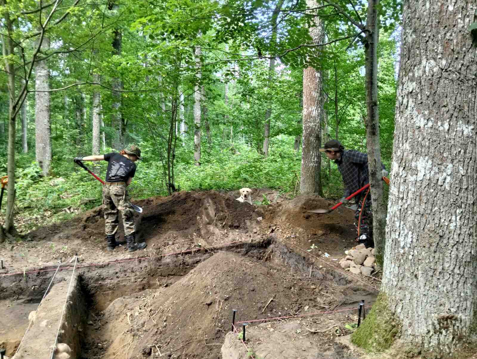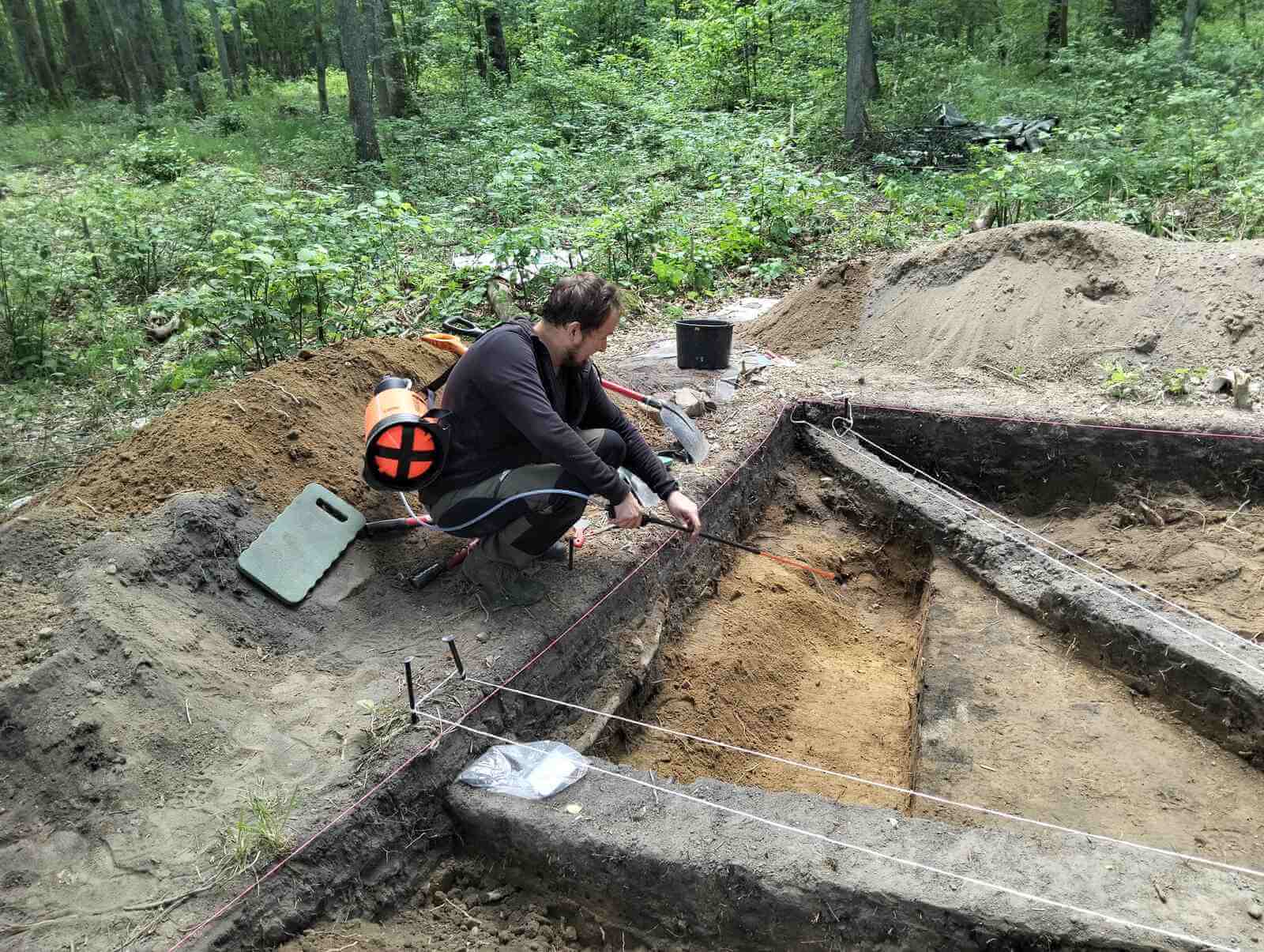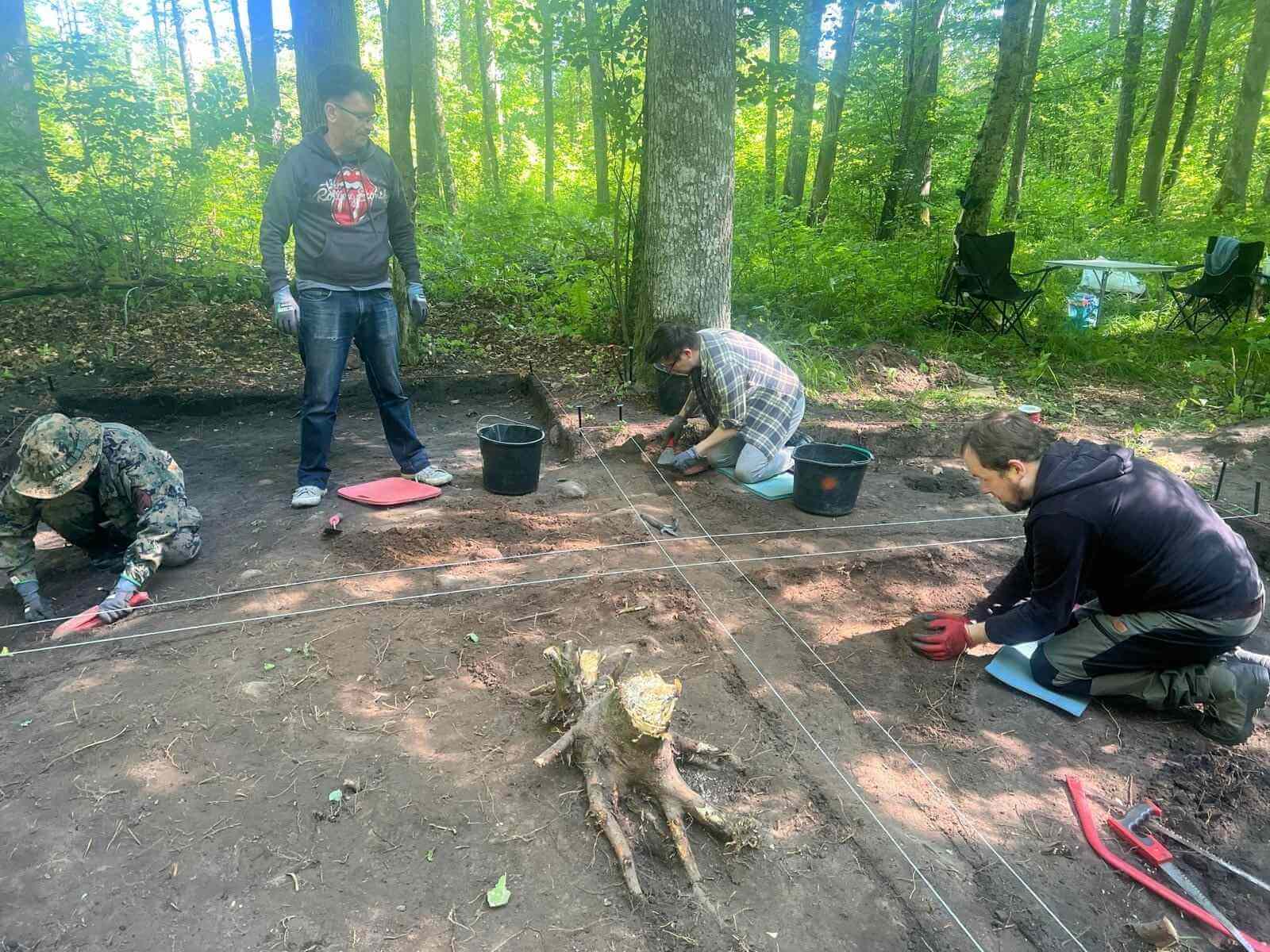 Ponadto nie przyniosły rezultatów szeroko zakrojone detektorystyczne poszukiwania nekropolii. Stanowisko znajduje się na rubieżach Jaćwieży, nie posiada jednak żadnych, nawet najskromniejszych śladów umocnień. Położone natomiast jest w miejscu, w którym sądzimy, że przecinały się lokalne szlaki. Przeprowadzone na nim pomiary geofizyczne również dały skromne wyniki, w postaci tylko dwóch wyraźniejszych anomalii. I właśnie te wskazania aktualnie eksplorujemy, w efekcie czego w jednym z wykopów natknęliśmy się na obiekt wstępnie przypominający piec bądź palenisko. Wśród zgromadzonych kamieni obserwujemy liczne ślady węgli oraz gliny, a także przepaloną wokół warstwę ziemi z wieloma zagłębieniami wypełnionymi spalenizną.