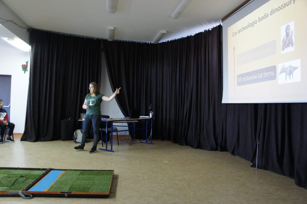 Uczniowie odkrywają na planszy szkielet konia.