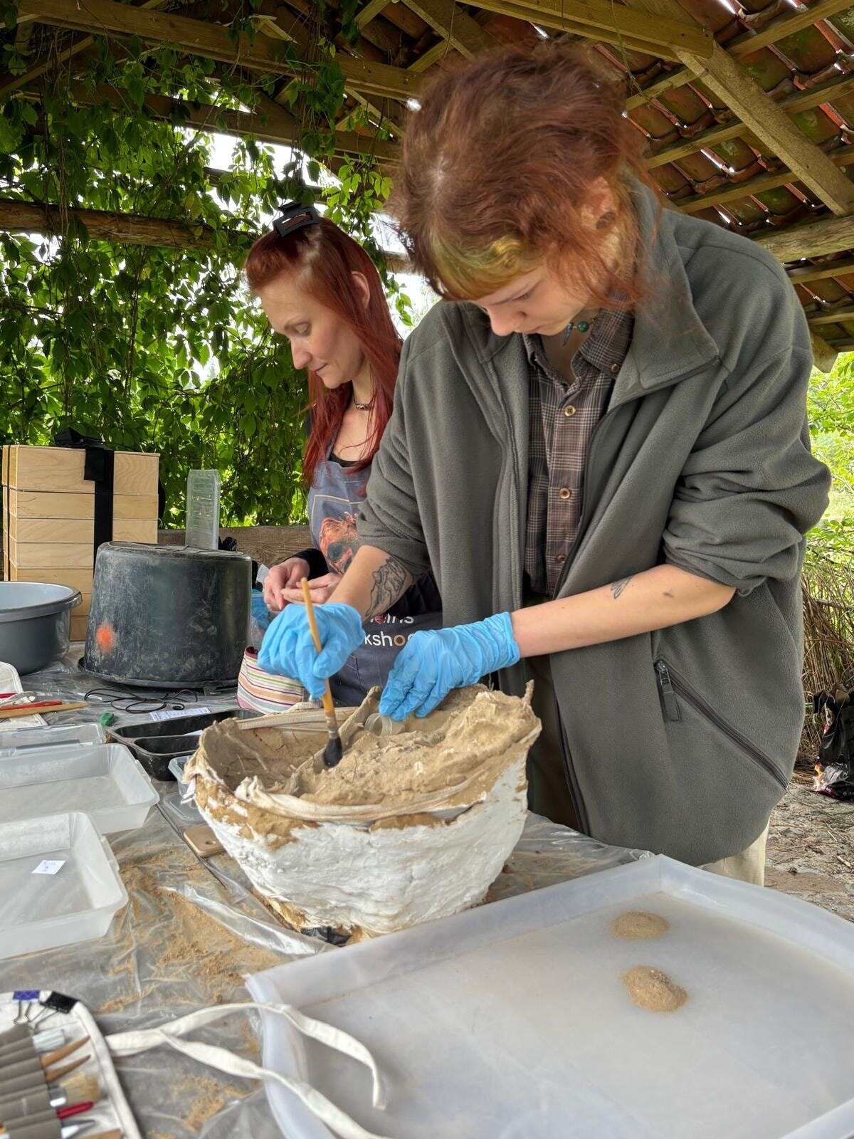 W konsekwencji tego przeprowadziliśmy ponowne poszukiwania z użyciem wykrywaczy metali, tym razem jednak skupiając się na sygnałach ceramicznych. I tutaj osiągnęliśmy powodzenie, gdyż w dwóch obszarach natrafiliśmy na koncentracje polepy. Aktualnie zatem, w jednym z wykopów eksplorujemy obiekt, wydaje się mający cechy dużego pieca, o prawdopodobnie charakterze gospodarczym. W przypadku drugiego wykopu jesteśmy dopiero w trakcie jego odsłaniania.