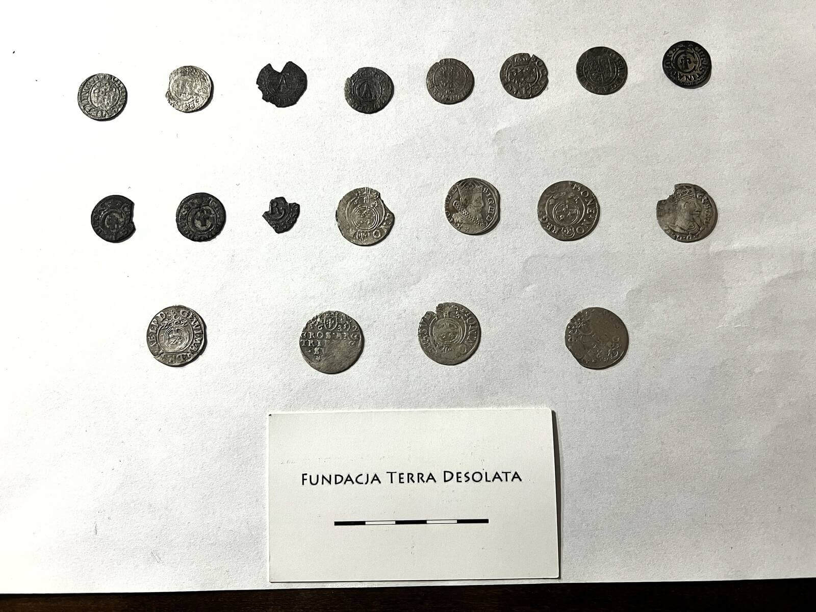 Łącznie pozyskaliśmy 20 monet wybitych w latach 20-tych i 30-tych XVII wieku. Są to pruskie i szwedzkie solidy (szelągi) oraz polskie i litewskie grosze. Widnieją na nich herby oraz wizerunki lub symbole kilku władców, tj.: króla Polski Zygmunta III Wazy, króla Szwecji Gustawa Adolfa, królowej Szwecji Krystyny Wazówny oraz księcia Prus Książęcych Jerzego Wilhelma Hohenzollerna. 6 numizmatów jest polskich, 3 są pruskie, a 11 jest szwedzkich. Przewagę liczebną tych ostatnich można wiązać z militarną obecnością szwedzką na Pomorzu w latach ich wybicia.