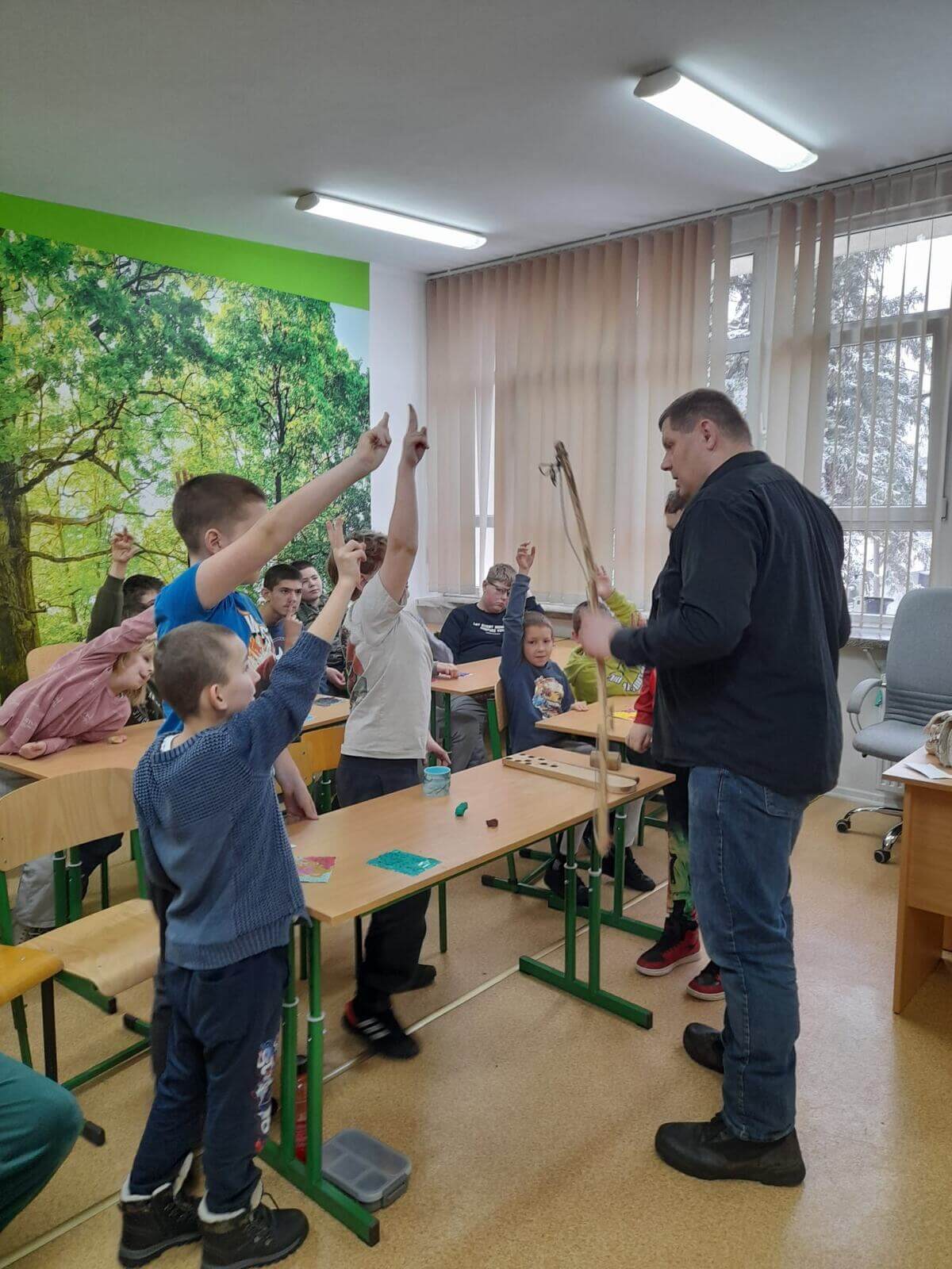 Wspólnie oglądaliśmy skamieliny, przebieraliśmy się w dawne stroje, tkaliśmy, niszczyliśmy mury strzelając z katapulty, wykonywaliśmy ozdoby z drutu…. Robiliśmy też dym (za pomocą łuku ogniowego 😉 ).
