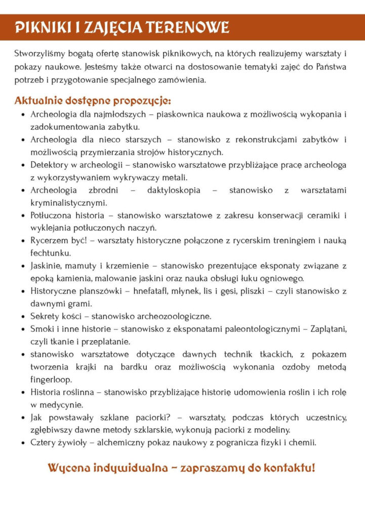 Jeśli chcecie zaprosić nas do swojej szkoły lub przedszkola – mamy propozycje zajęć dla małych i dużych! Przyjeżdżamy z rekwizytami, grami i innymi pomocami naukowymi. Za ich pomocą opowiadamy o archeologii, zapomnianych ludach i dawnych, wielkich cywilizacjach! A przy okazji dobrze się bawimy.