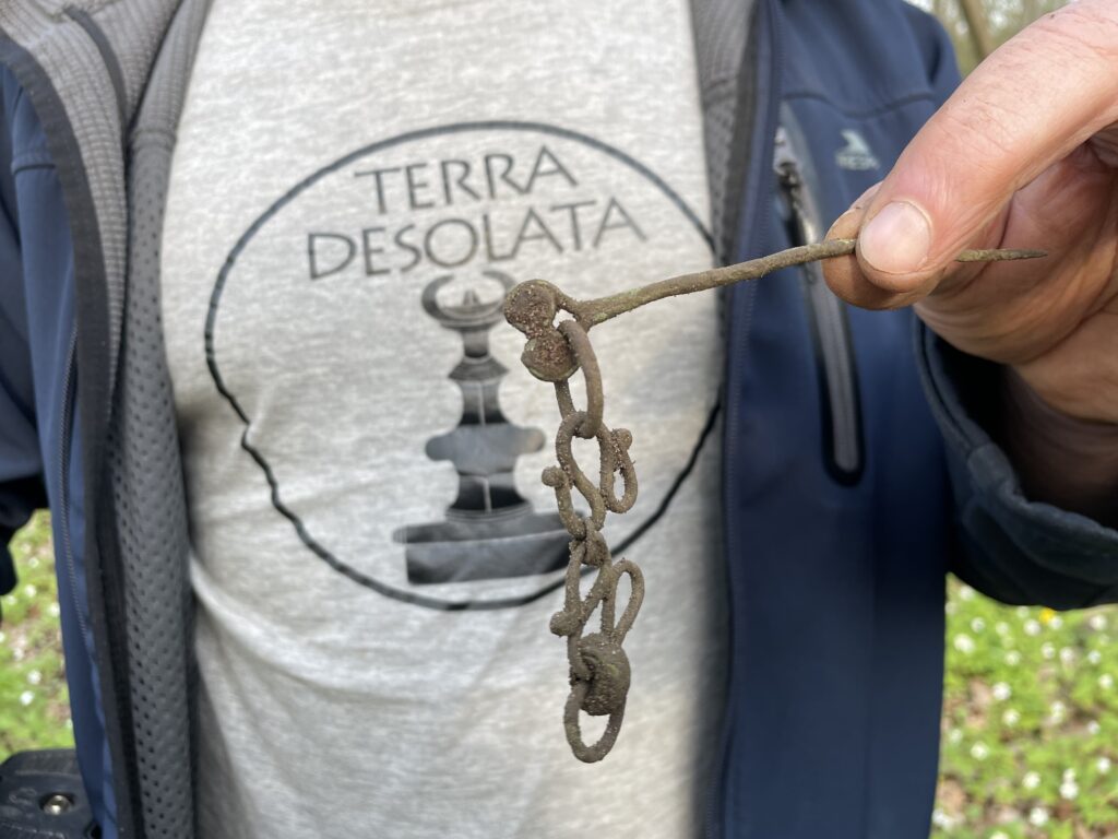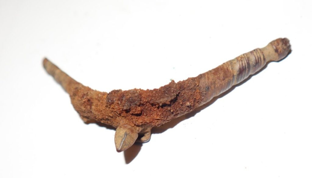Fot. 3. Żelazna ostroga – częściowo pokryta patyną ogniową (efekty przebywania w wysokiej temperaturze stosu pogrzebowego) – w okolicy (?) cmentarzyska Rothebude. Jest jeszcze jednak zbyt wcześnie aby obwieszczać sukces związany z ponownym odnalezieniem tego stanowiska. Prace są w toku.